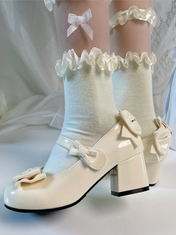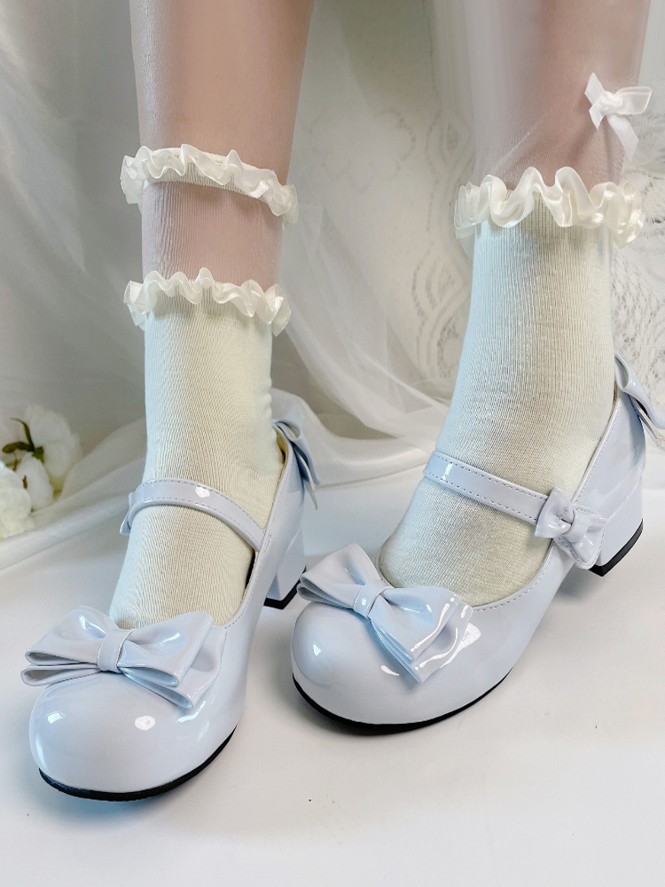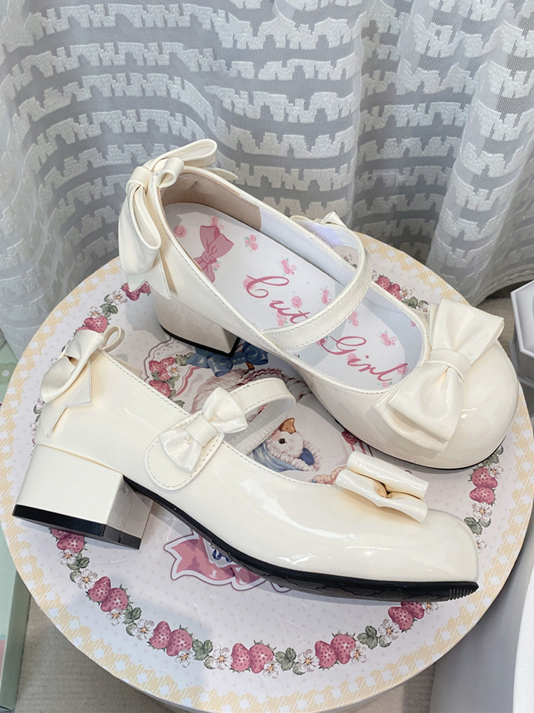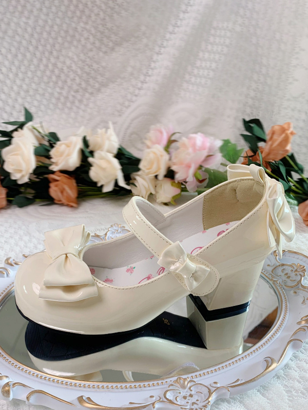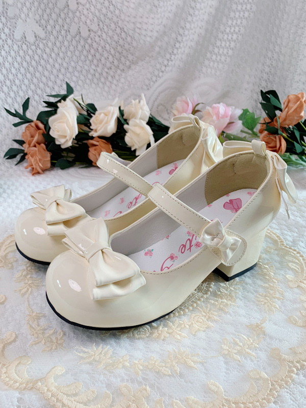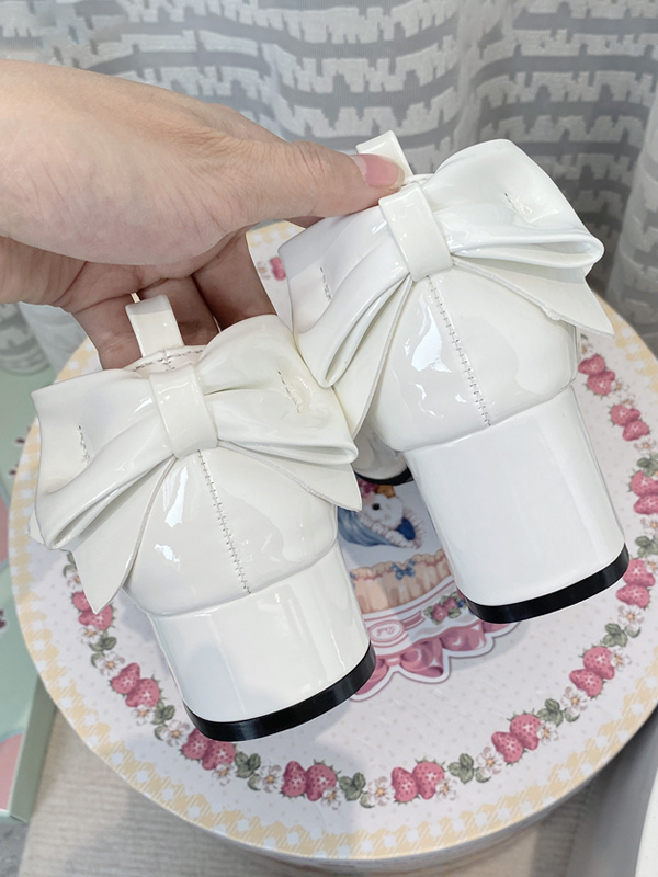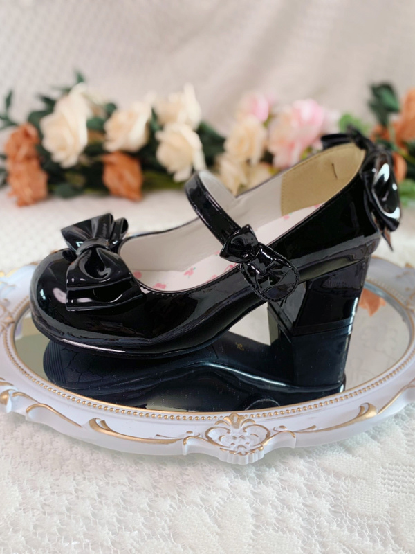 スイートロリータシューズ ピンクリボン ラウンドトゥ PUレザー パピーヒール ロリータパンプス