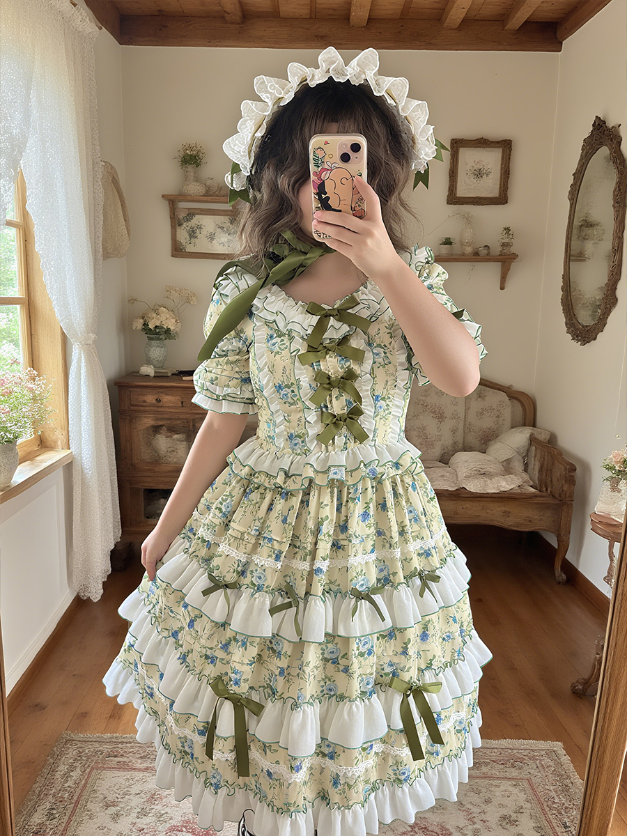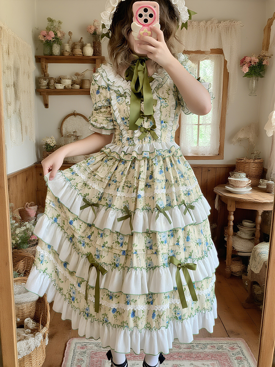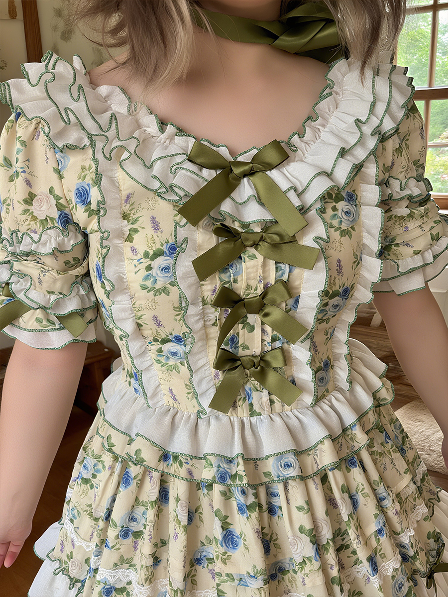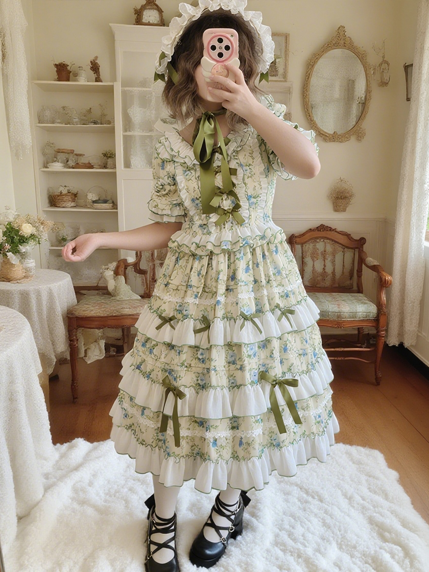 The neckline and cuffs of the dress feature ruffles and green ribbons that look like flower petals~